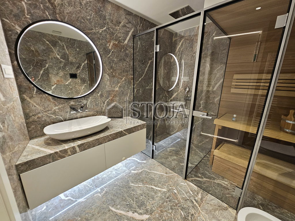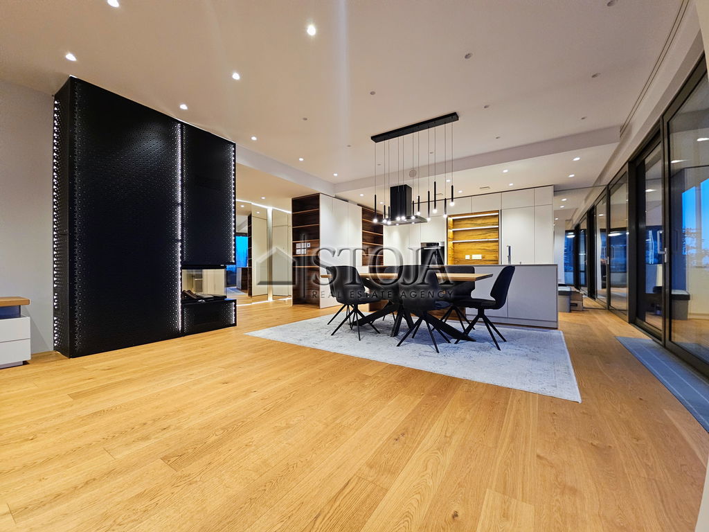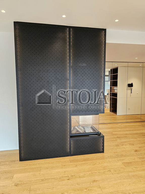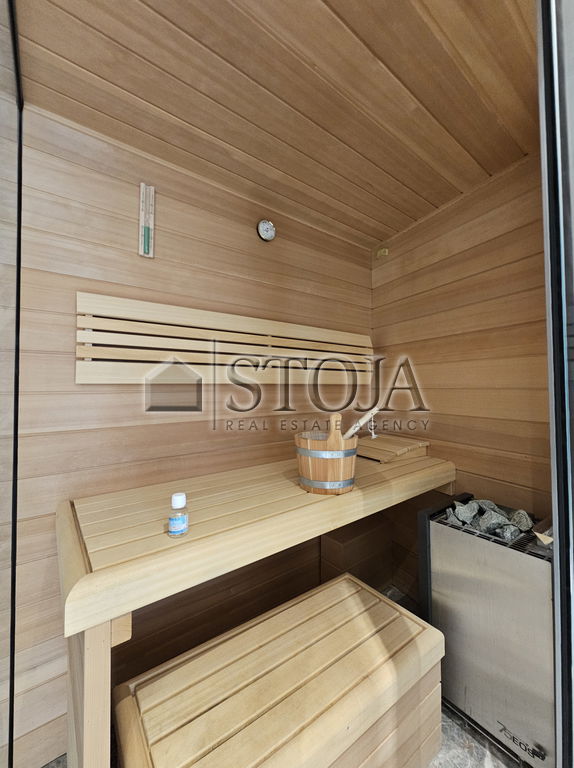 The apartment has 3 bedrooms and a walk-in closet. In addition, it has a large living room with an open kitchen, fireplace, and access to the terrace. The apartment also includes two bathrooms with showers, a sauna, and a separate toilet.