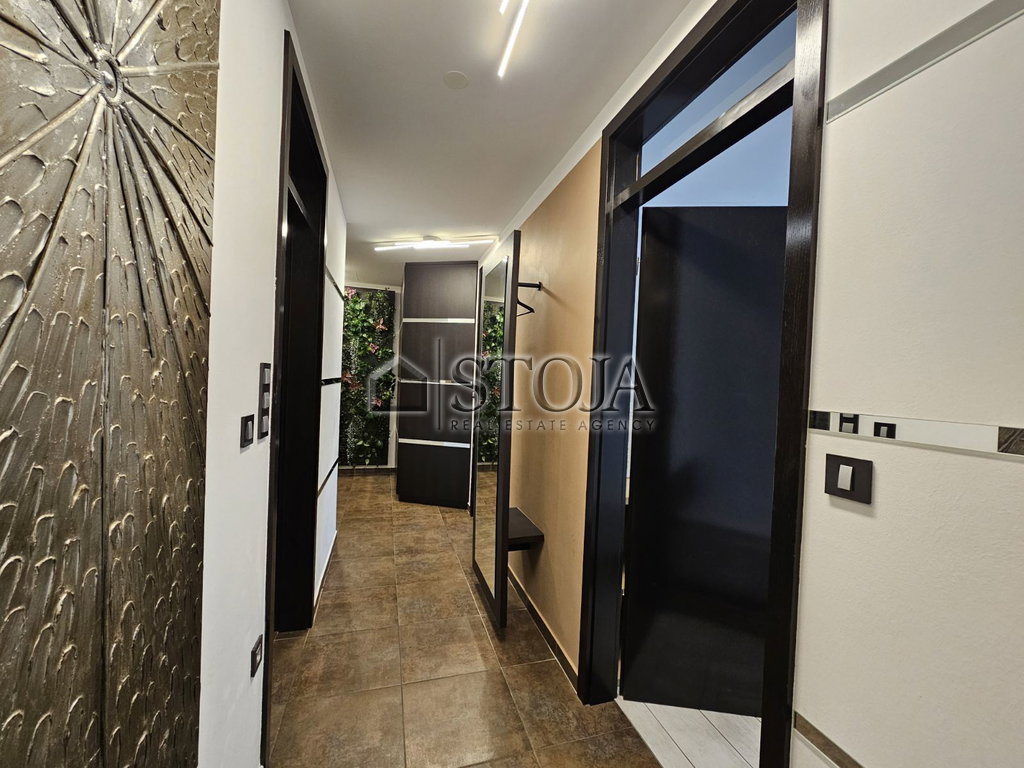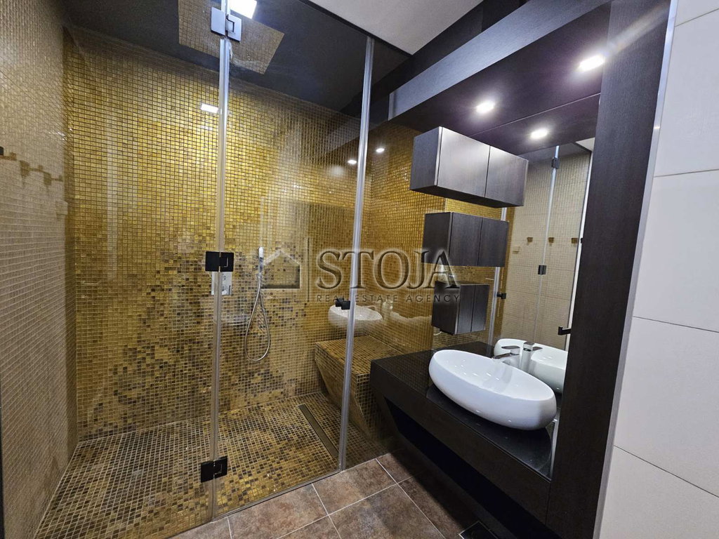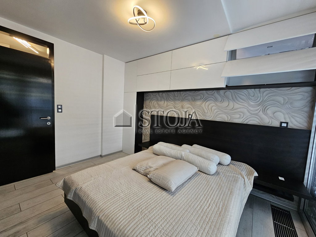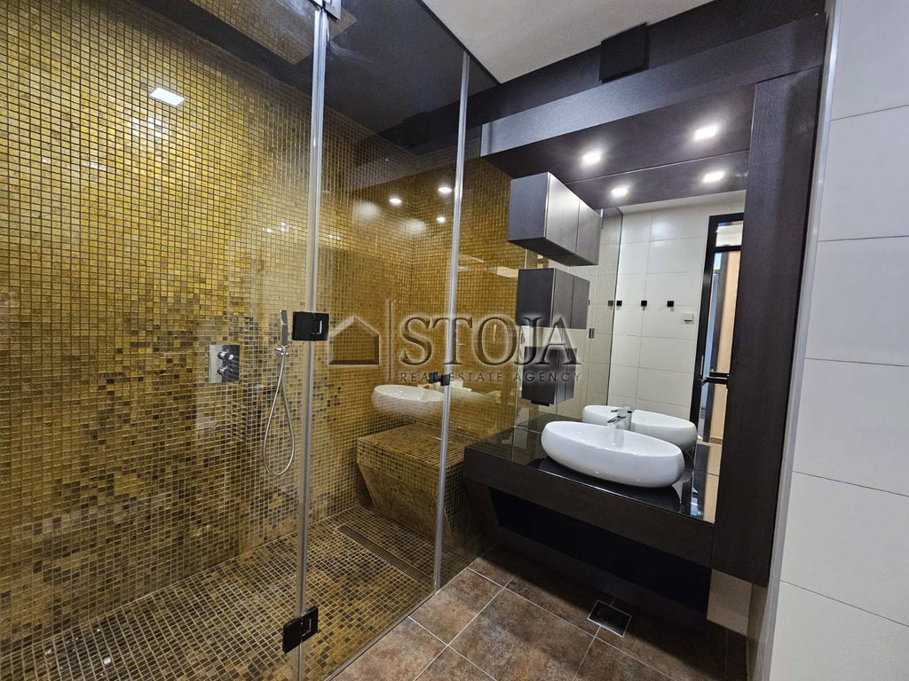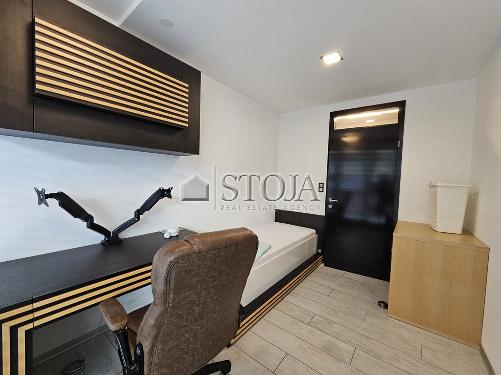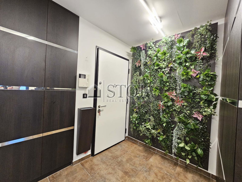 The apartment was renovated in 2017 and furnished with high-quality custom furniture and advanced technology. It includes underfloor heating, floor convectors (adjustable heating in each room separately), concealed air conditioning units (controlled also via mobile app), motorized external blinds, security doors, and smart installations.