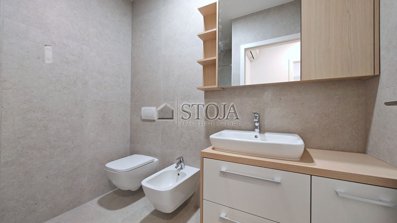 The apartment features high ceilings (2.65 m), local heat recovery ventilation, panoramic 3-layer ALU-PVC windows, wide oak lamella parquet flooring, underfloor heating, micro temperature control in all rooms, doors with concealed hinges, Geberit sanitary ceramics, Hansgröhe fittings, custom-made furnishings, Bosch appliances, etc.