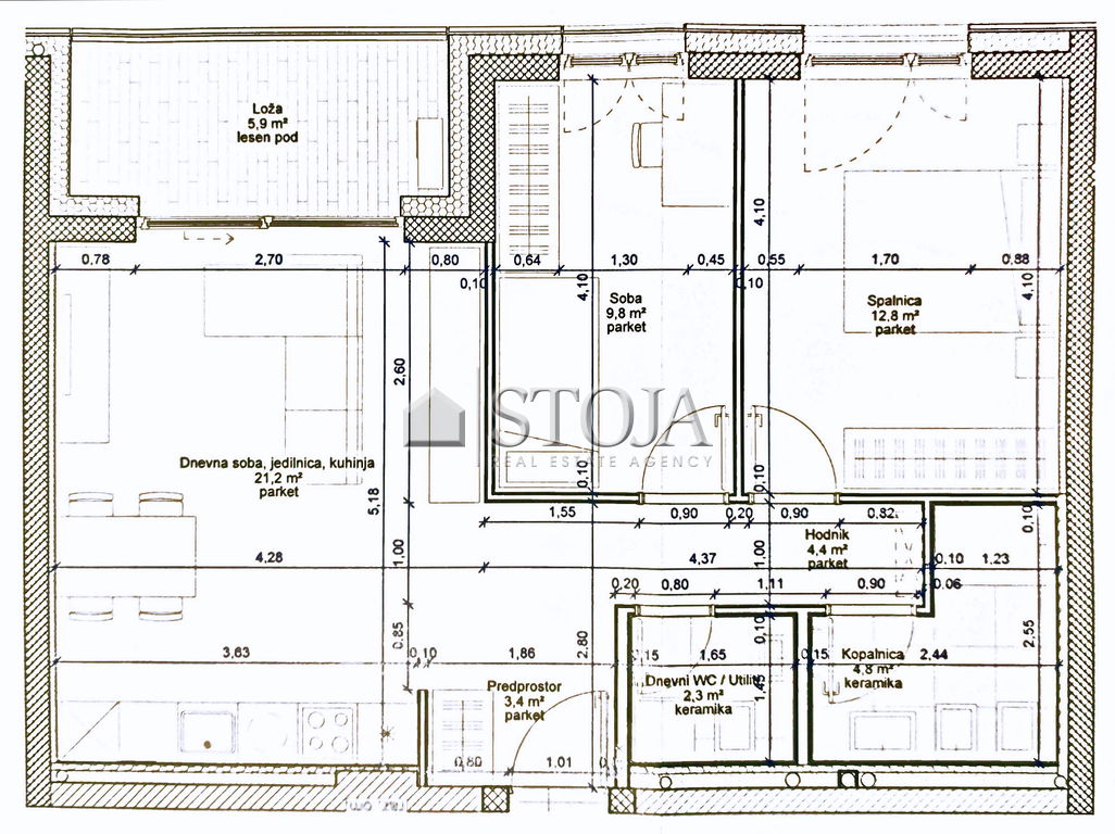 The apartment also includes one parking space in the underground garage and a cellar storage room (7.8 m2).