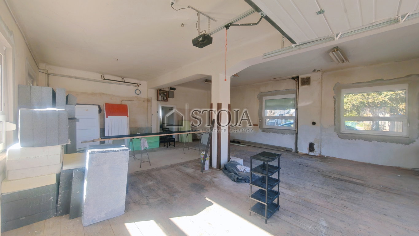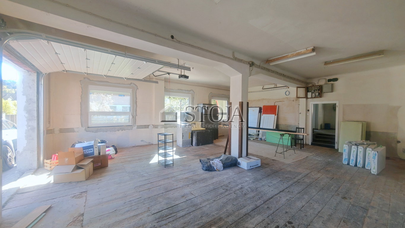 Further inside, there is a room for an office or changing room with a separate entrance, a bathroom, and a passage to a garage of 26 m2, which is also accessible from the outside via roller shutter doors.